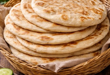 Freshly baked Arabic kubboos with a soft interior and lightly toasted surface.