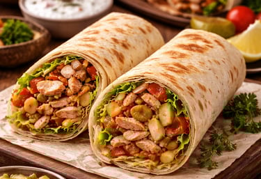 A delicious shawarma wrap filled with seasoned chicken, fresh vegetables, and creamy garlic sauce.