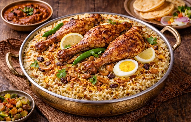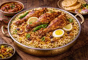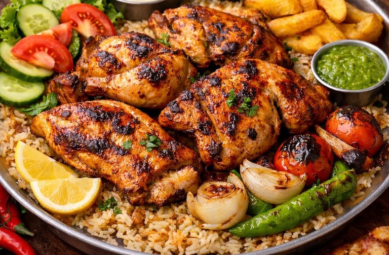 A traditional Arabian mandi served with fragrant basmati rice and perfectly roasted chicken.